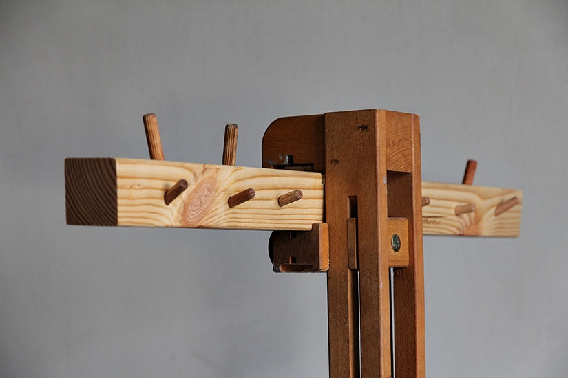 Материал - брус 80 мм. Соединения - дубовые шканты на полиуретановом клее, усиленные металлическими уголками. Основание - простая система шуруп-кольцо - капроновый трос.
